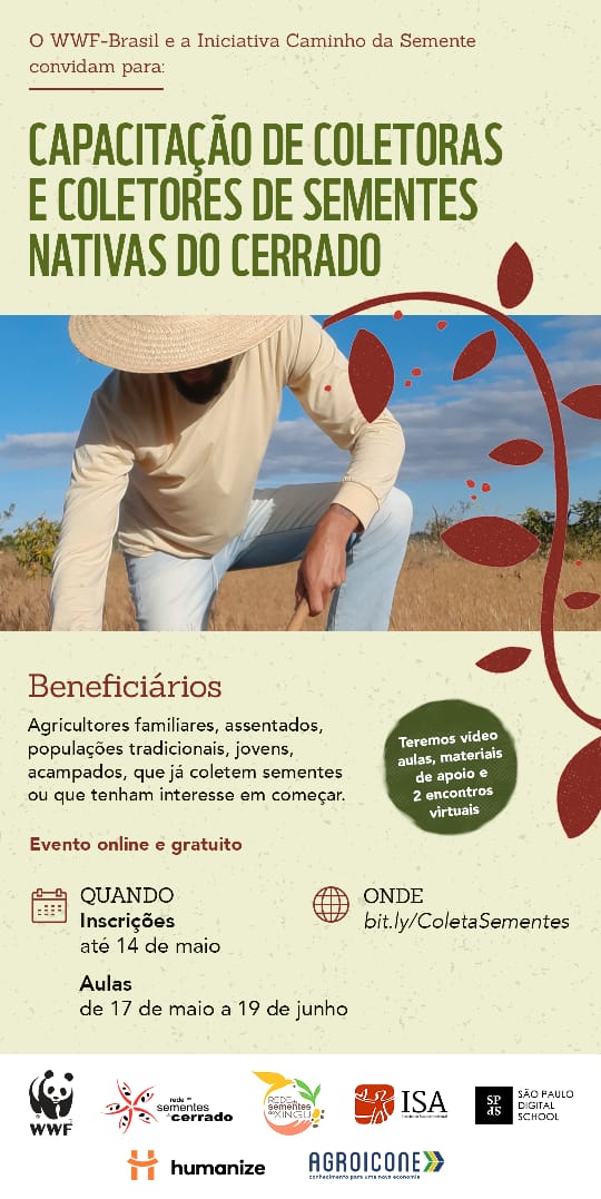 A WWF Brasil e a Iniciativa Caminhos da Semente (Agroícone) estão promovendo, com o apoio da Rede de Sementes do Cerrado (RSC), Rede de Sementes do Xingu e do Instituto Socioambiental, o “Curso EAD Coleta de Sementes para a Restauração do Bioma Cerrado”, que será oferecido gratuitamente para quem trabalha ou deseja trabalhar na coleta de sementes. Os interessados devem se inscrever até 14 de maio.