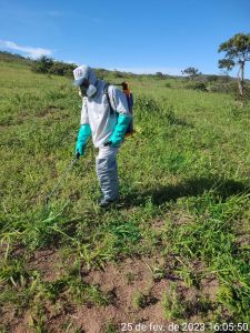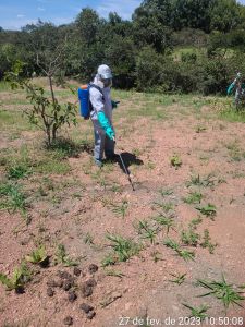 Técnico de campo Fábio Júnior Barbosa de Souza explicou que a equipe foi dividida em dois grupos. “Parte ficou no controle da exótica com herbicida e os demais na retirada com enxada. É preciso muita cautela com o uso da herbicida para que ela não chegue nas espécies que foram plantadas e estão germinando, por isso vamos separando um do outro com a bomba costal e só utilizamos em área com incidência de rebrota de capim bem significativa”, explicou.