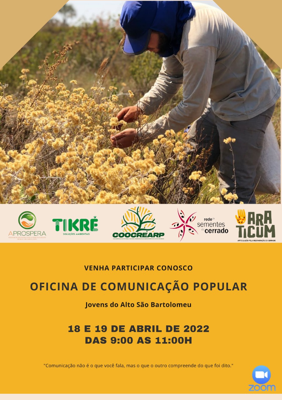 A equipe técnica que atua no projeto de Articulação pela Restauração do Cerrado (Araticum), promove nos dias 18 e 19 de abril, das 9h às 11h, a Oficina de Comunicação Popular. Voltada para os jovens que integram a Associação dos Produtores Agroecológicos do Alto São Bartolomeu (Aprospera), a ação visa contribuir com o desenvolvimento do grupo por meio de técnicas de comunicação popular, criação de roteiro e conteúdo.