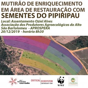 A Rede de Sementes do Cerrado (RSC) promove nesta sexta-feira, 20, o Mutirão de Enriquecimento em Área de Restauração com sementes do Pipiripau. Em parceria com o núcleo de coletores do Pipiripau e voluntários, a ação acontece a partir das 8h30, no Assentamento Oziel Alves, ao lado da sede da Associação dos Produtores Agroecológicos do Alto São Bartolomeu (APROSPERA).