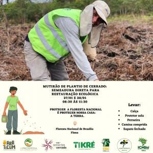 Acontece nesta sexta-feira, 27, e no sábado 28, a partir das 8h30 na Floresta Nacional de Brasília (Flona), Mutirões de Plantio de Sementes Nativas do Cerrado. A iniciativa tem como foco a restauração ecológica da área em que foi realizada, em 2022, a retirada dos Pinheiros, árvores do gênero “Pinus sp” que são consideradas Espécies Exóticas Invasoras (EEI).