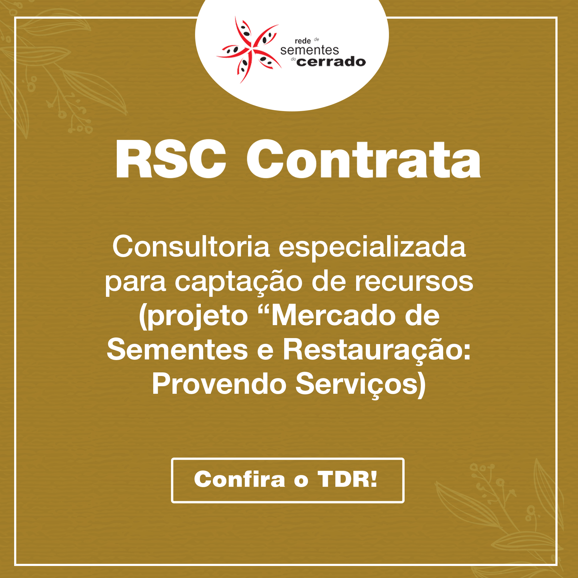 A Rede de Sementes do Cerrado (RSC) está contratando serviço técnico especializado de “Consultoria em Captação de Recursos” para a execução do projeto “Mercado de Sementes e Restauração: Provendo Serviços Ambientais e Biodiversidade”. Os interessados devem enviar proposta para o e-mail sementescepf@rsc.org.br até 10/05/2021.