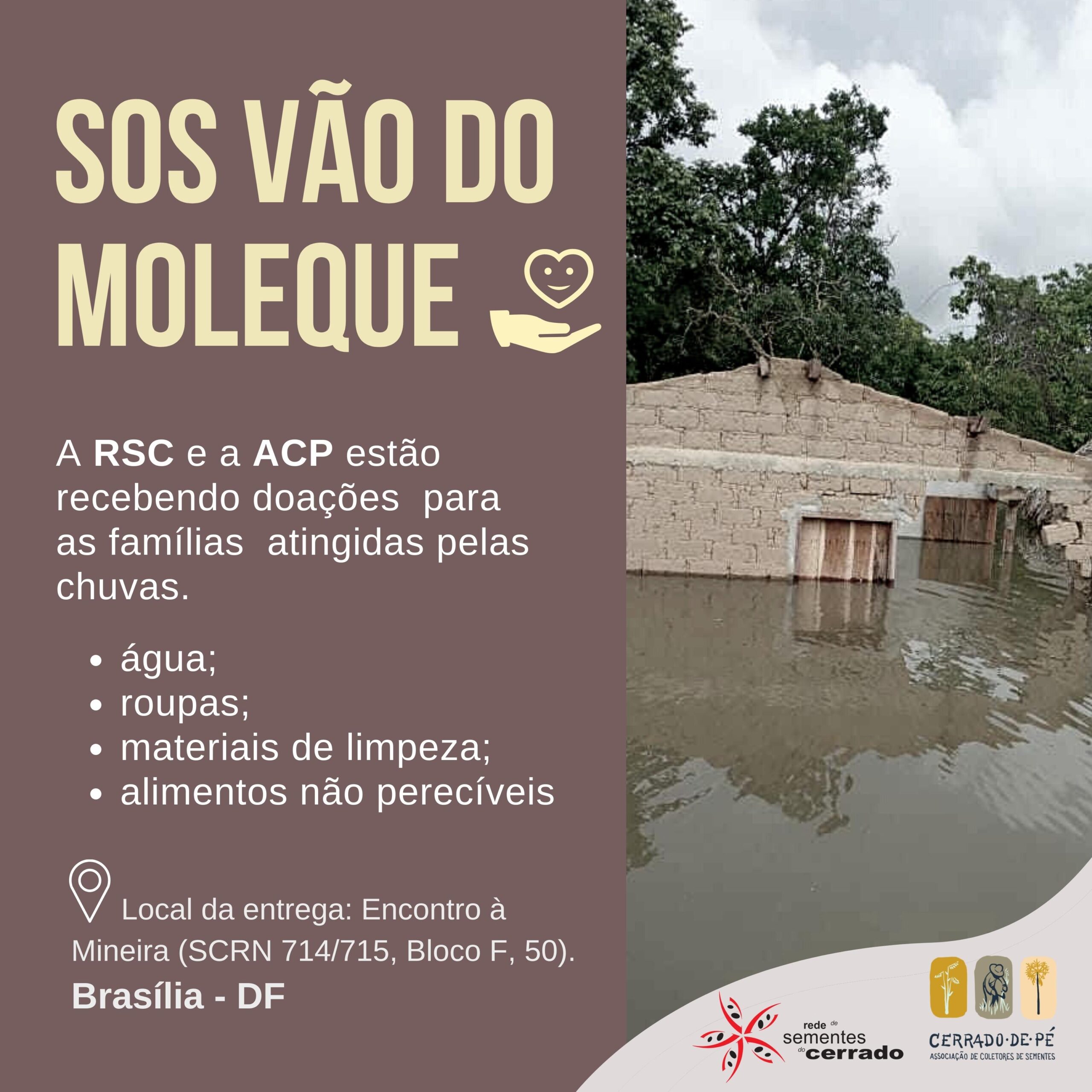 Ao lembrar que boa parte dos coletores de sementes nativas que integram a Associação Cerrado de Pé vivem no Vão do Moleque, o Diretor de Restauração da ACP, Claudomiro de Almeida explica que com as chuvas intensas, erosões nas estradas e queda das pontes as famílias encontram-se ilhadas e que os itens arrecadados serão entregues assim que possível. “Nós estamos vendo a viabilidade de ajudar estas famílias, uma vez que neste momento o acesso está inviável. Mas, vamos seguir com a arrecadação e assim que possível levar tudo que for arrecadado para dar o mínimo de apoio às famílias da comunidade”, acrescenta Claudomiro.