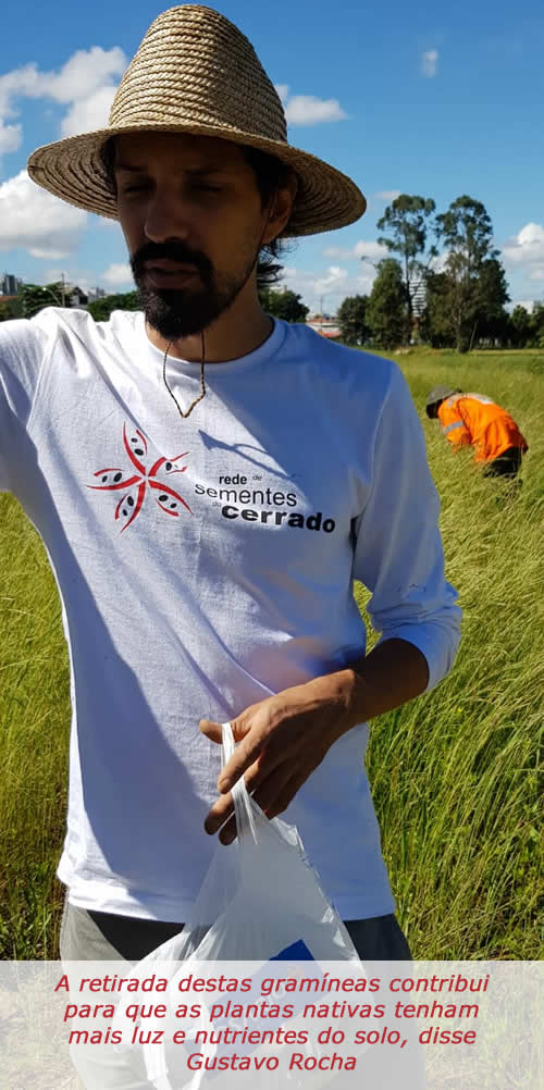 “Esta já foi uma área de pastagem, invadida por capins exóticos. A retirada destas gramíneas contribui para que as plantas nativas tenham mais luz e nutrientes do solo. Na verdade estamos dando uma mãozinha para que as nativas possam desenvolver e a restauração dê muito certo”, salientou Gustavo Rocha, técnico da Rede de Sementes do Cerrado. O técnico frisou ainda que o resultado final deste trabalho de restauração é reestabelecer o ecossistema original do Parque garantindo a diversidade da fauna.